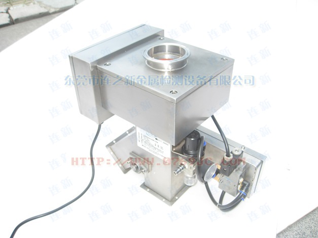 原料從料斗或送料器自由下落進(jìn)入金屬分離器,如果沒(méi)有金屬雜質(zhì),原料會(huì)直接通過(guò)金屬分離器流向下端的出料口。如果檢測(cè)器檢測(cè)到原料中含有金屬,那么控制器立刻啟動(dòng)分離板將金屬物和部分原料一起導(dǎo)向側(cè)面的排料口,然后分流板迅速恢復(fù)至正常的位置,分流板速度可調(diào),金屬分離器的檢測(cè)精度也可根據(jù)生產(chǎn)需要調(diào)節(jié),最小可檢測(cè)并分離出Φ 0.2mm的金屬顆粒。